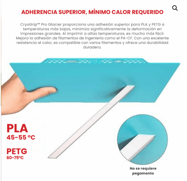 La placa de impresión CryoGrip Pro Glacier de 310×315 mm está diseñada para brindar una experiencia de impresión más eficiente, segura y sin necesidad de cama caliente. Gracias a su superficie texturada fina y recubrimiento multicapa autorreparable, esta base ofrece una excelente adhesión para una amplia gama de filamentos, incluyendo PLA, PETG, TPU, ABS, PA y PC. Compatible con impresoras como Creality K1 Max, Ender-3 V3 Plus y Ender-3 S1 Plus, esta placa permite imprimir incluso a temperatura ambiente, reduciendo significativamente el consumo energético. Su diseño con acero elástico permite una remoción sencilla de las piezas impresas con solo una leve flexión al enfriarse. La superficie CryoGrip Glacier es oleofóbica y resistente al desgaste, manteniéndose limpia y funcional con solo lavados ocasionales con agua o alcohol. La instalación magnética asegura un ajuste rápido y preciso. Ideal para usuarios que imprimen de forma intensiva y buscan una base confiable, fácil de mantener y adaptable a materiales técnicos y convencionales.