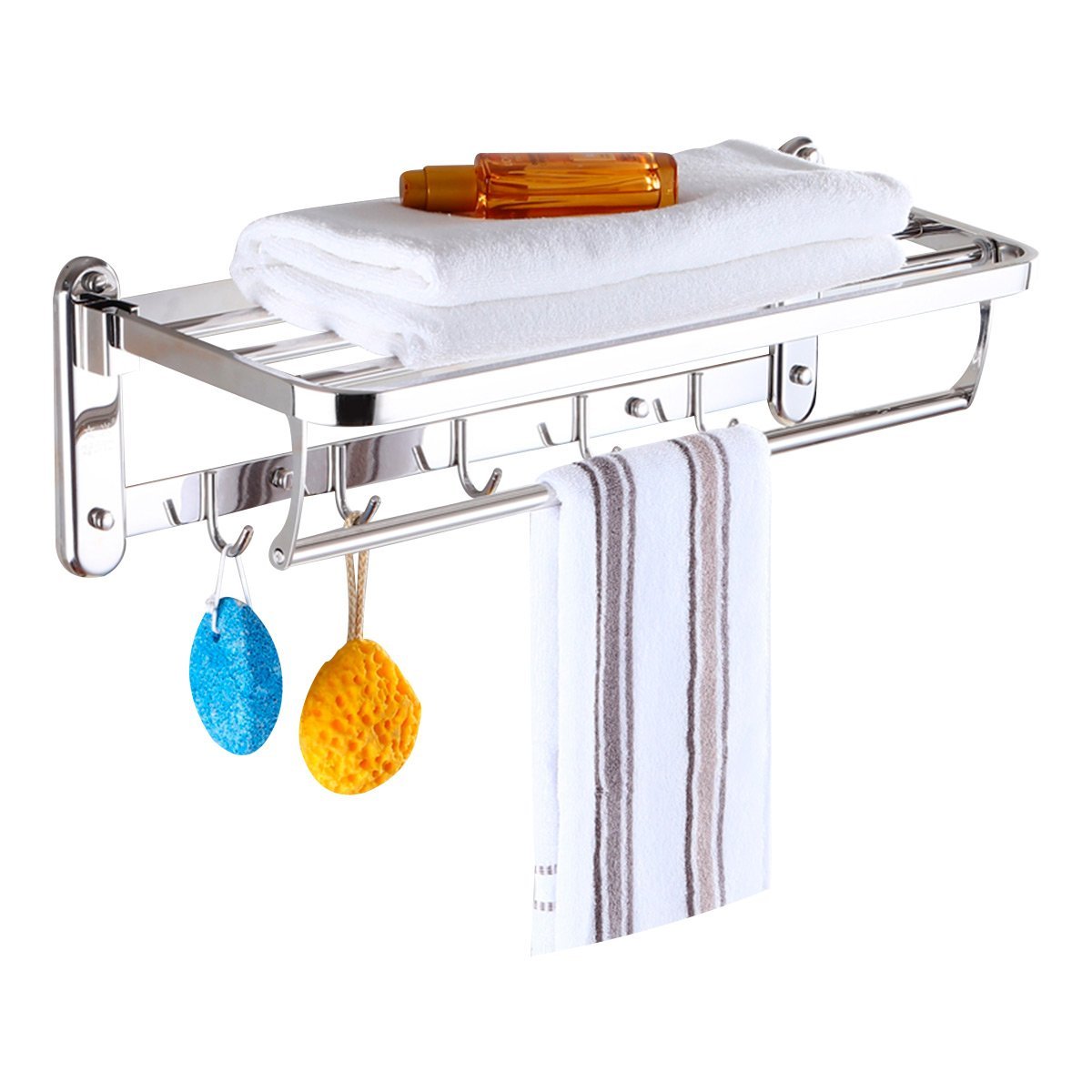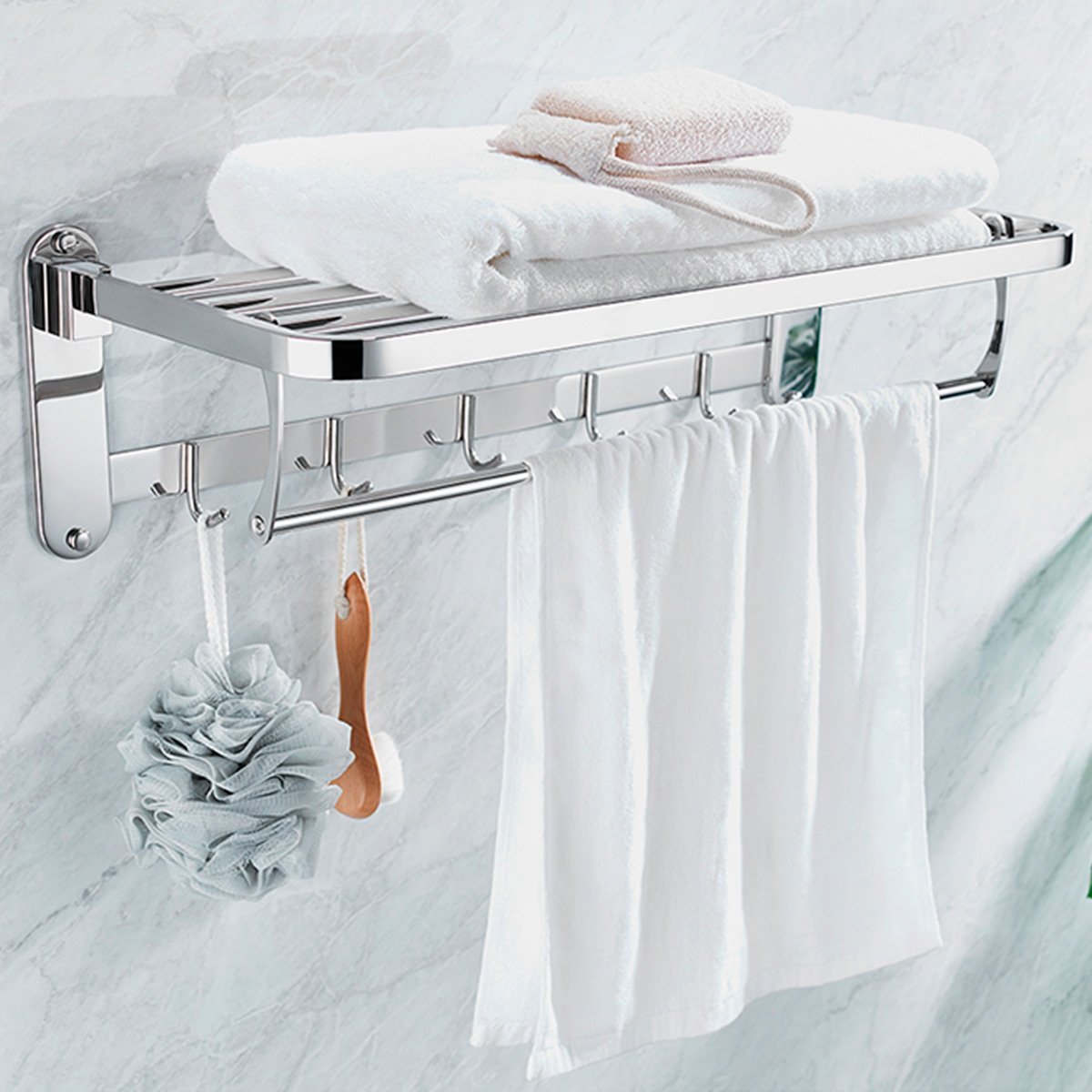 Estante rebatible, toallero barral y cinco ganchos