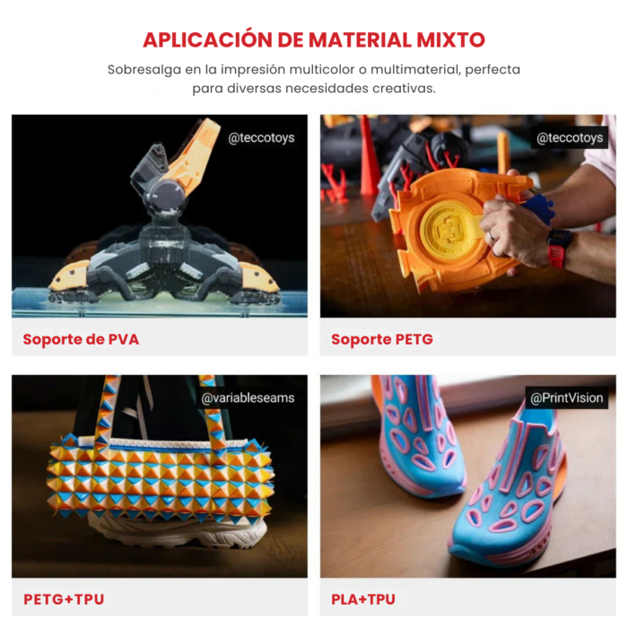 Capacidad Multimaterial Real: Puedes combinar materiales incompatibles en la misma impresión (ej. PLA con soporte de PETG, o TPU con PLA rígido) sin atascos, ya que cada material tiene su propio conducto térmico.